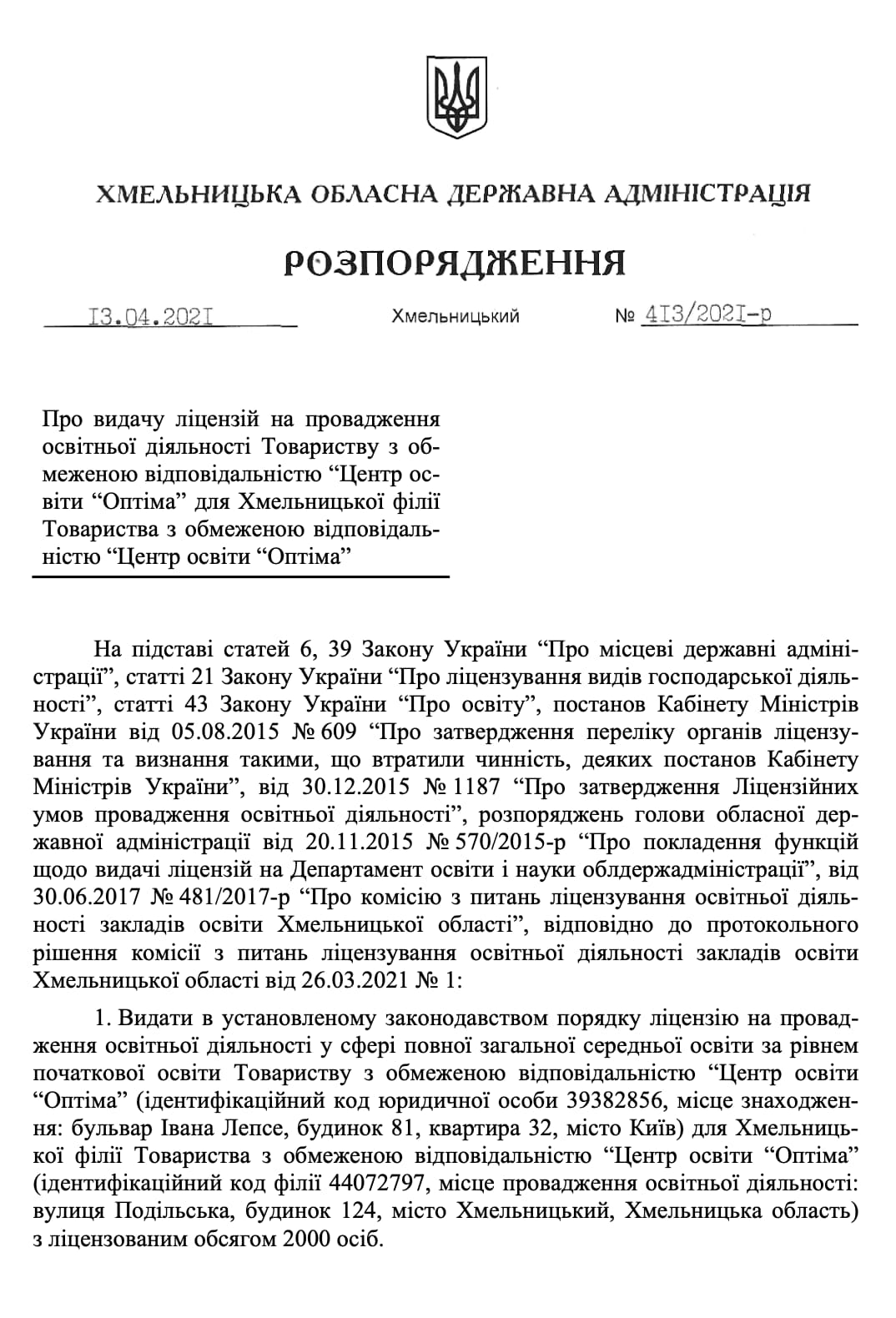 | 8. | Ліцензія на право провадження освітньої діяльності у сфері повної загальної середньої освіти за рівнем базової середньої освіти | Розпорядження Хмельницької обласної державної адміністрації від 13.04.2021 року № 413/2021-р | Безстрокова |