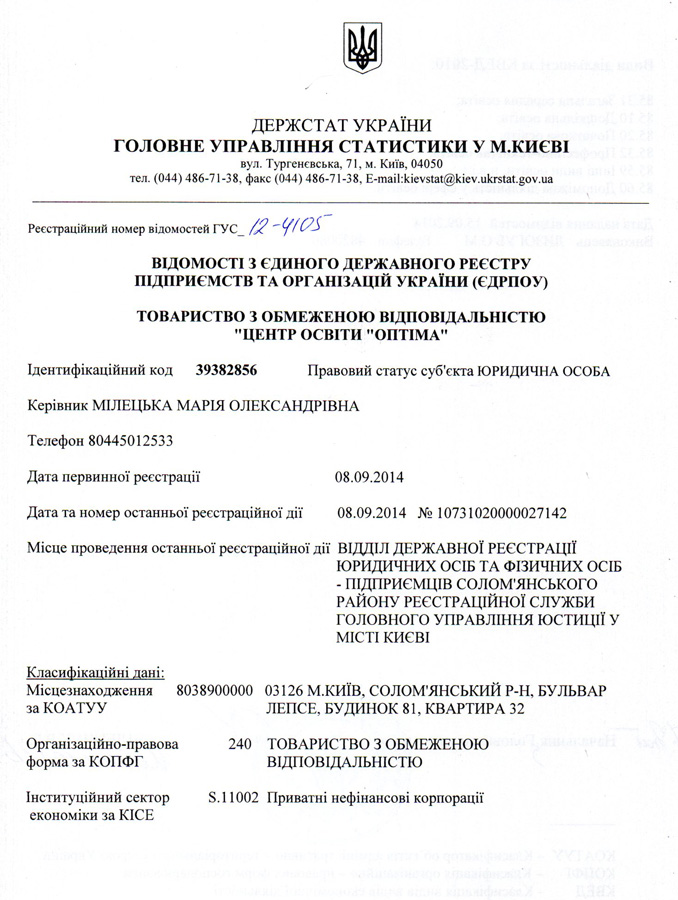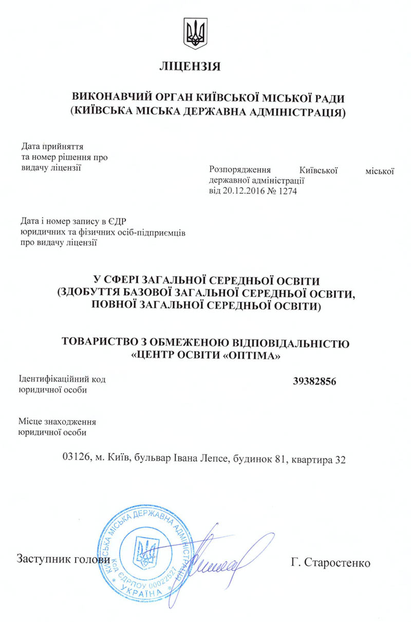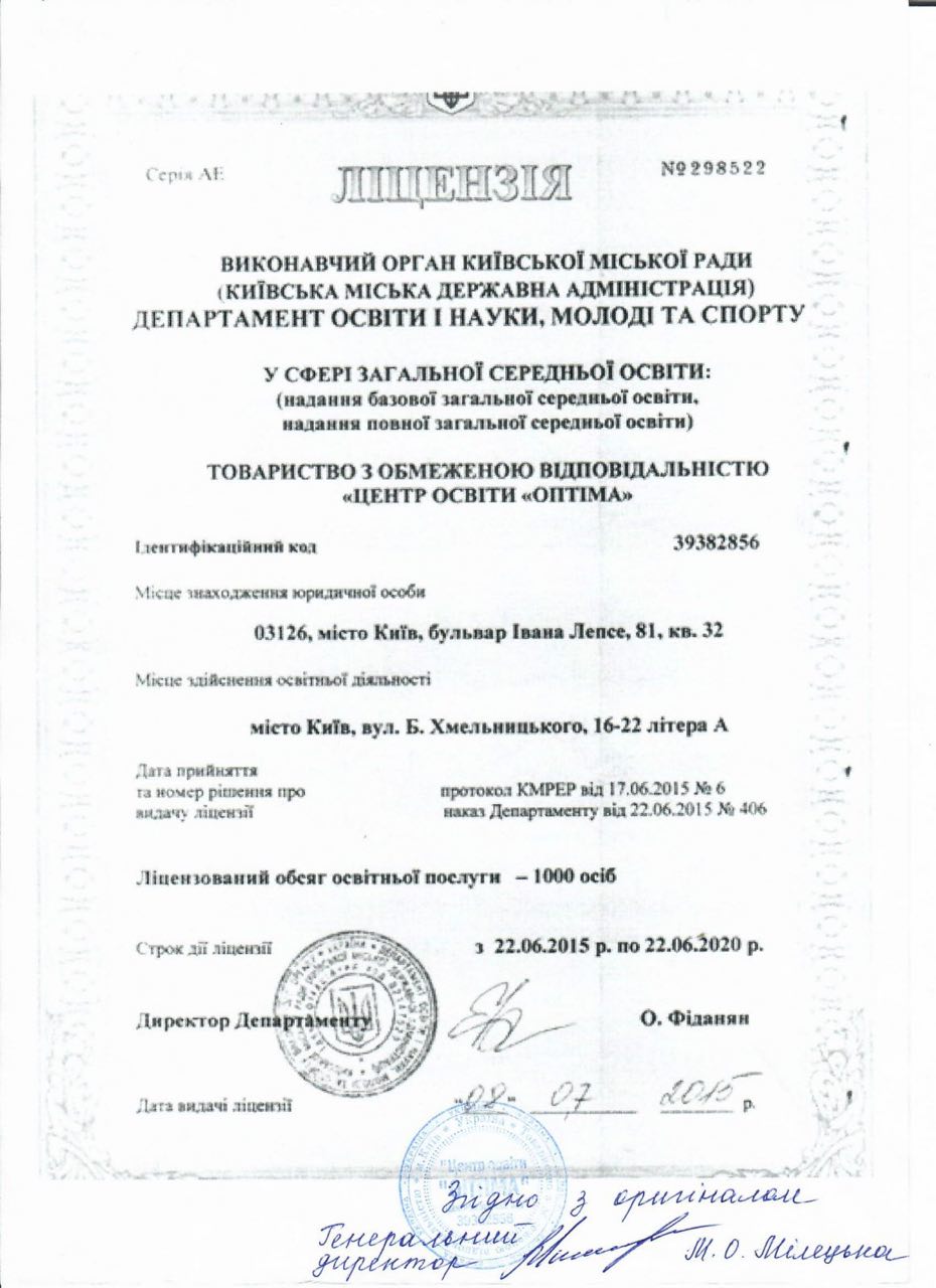 | 2. | Ліцензія на право провадження базової та повної загальної середньої освіти | Розпорядження Київської міської державної адміністрації від 20.12.2016 року № 1274 | Безстрокова |