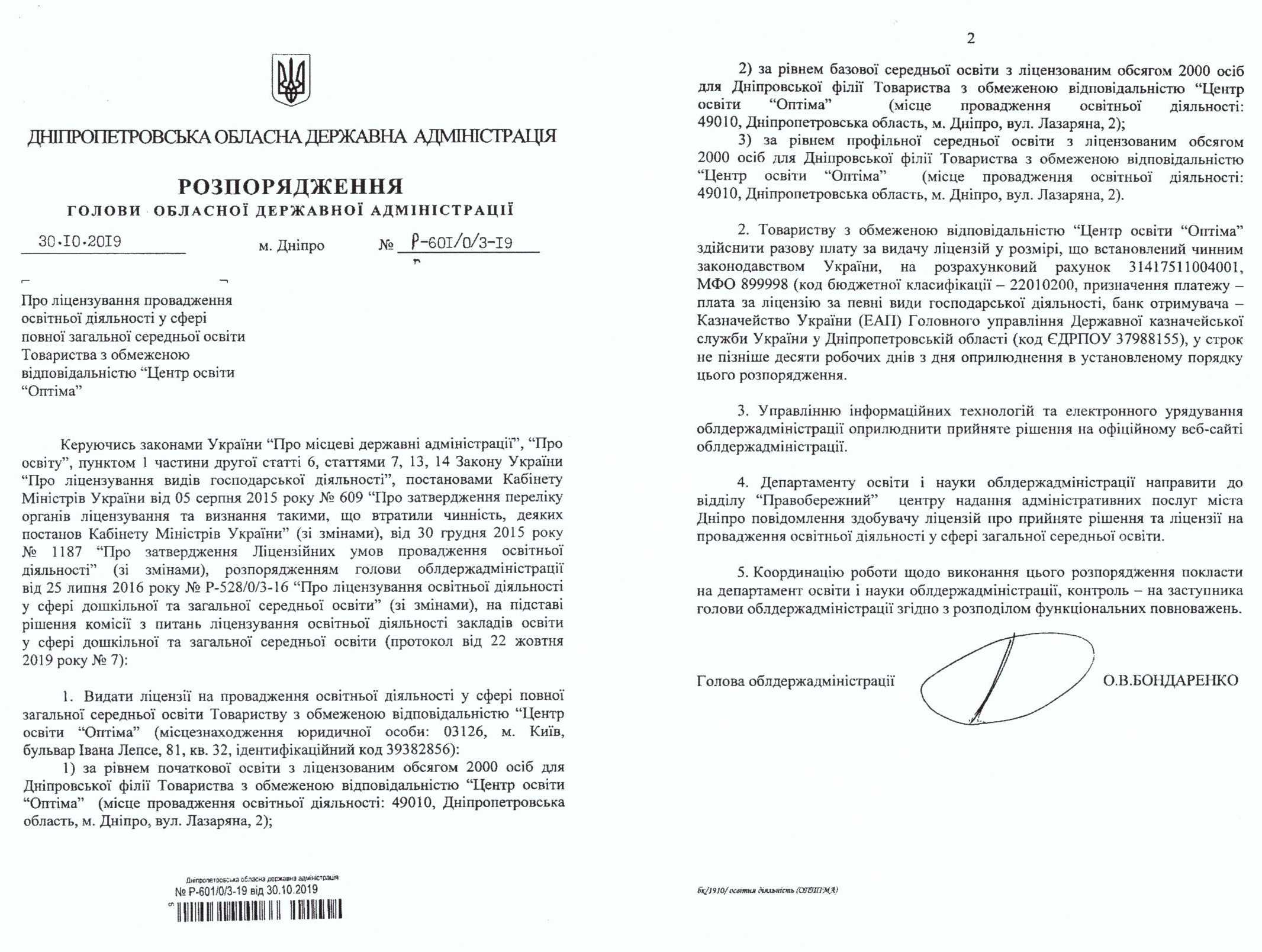 | 6. | Ліцензія на провадження освітньої діяльності у сфері повної загальної середньої освіти за рівнем профільної середньої освіти | Розпорядження Дніпропетровської обласної державної адміністрації від 30.10.2019 року № Р-601/0/3-19 | Безстрокова |