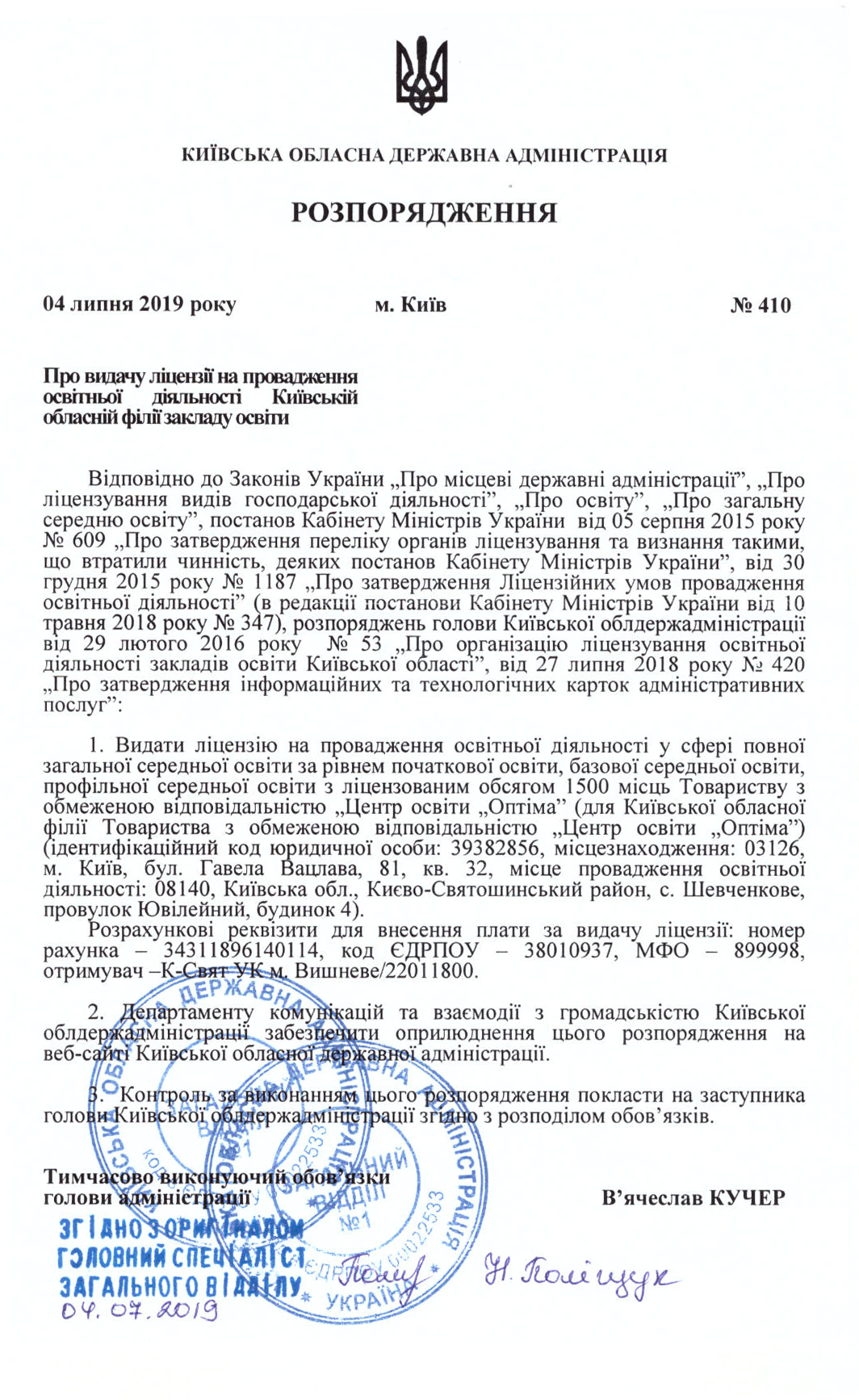 | 3. | Ліцензія на провадження освітньої діяльності у сфері повної загальної середньої освіти за рівнем початкової освіти, базової середньої освіти, профільної середньої освіти | Розпорядження Київської обласної державної адміністрації від 04.07.2019 року № 410 | Безстрокова |