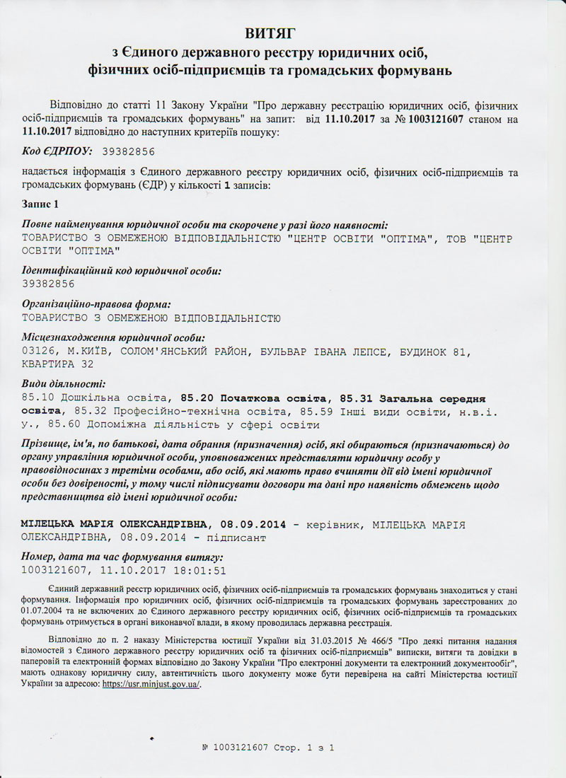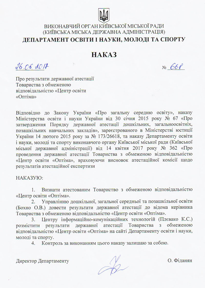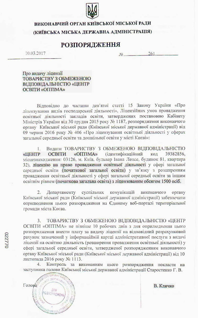 | 1. | Ліцензія на право провадження початкової загальної середньої освіти | Розпорядження Київської міської державної адміністрації від 10.03.2017 року № 261 | Безстрокова |