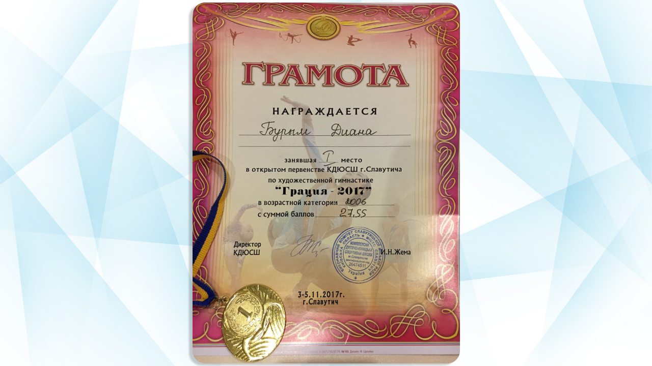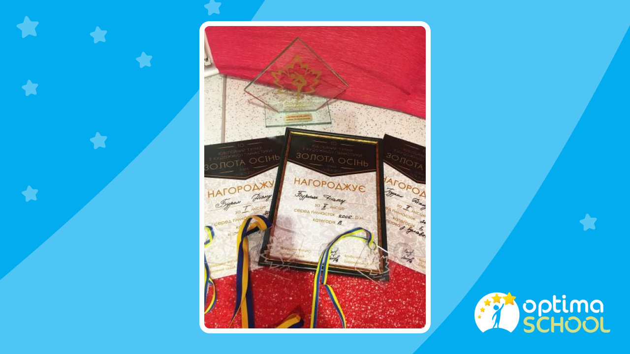 Учениця 5 класу Центра освіти «ОПТІМА» Бурим Діана успішно поєднує навчання в дистанційній школі з улюбленим хобі, яке давно вийшло на професійний рівень. Діана займається художньою гімнастикою вже сьомий рік.
