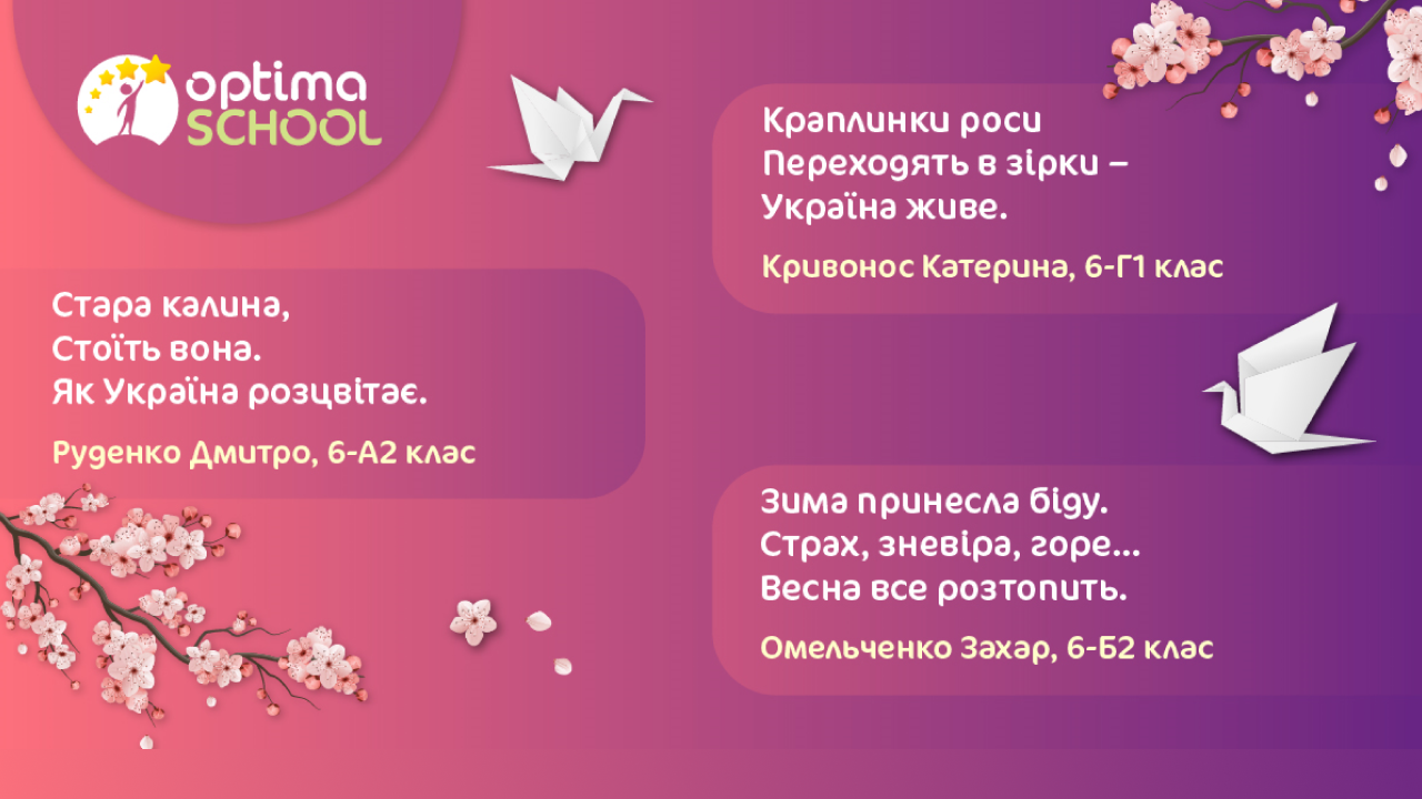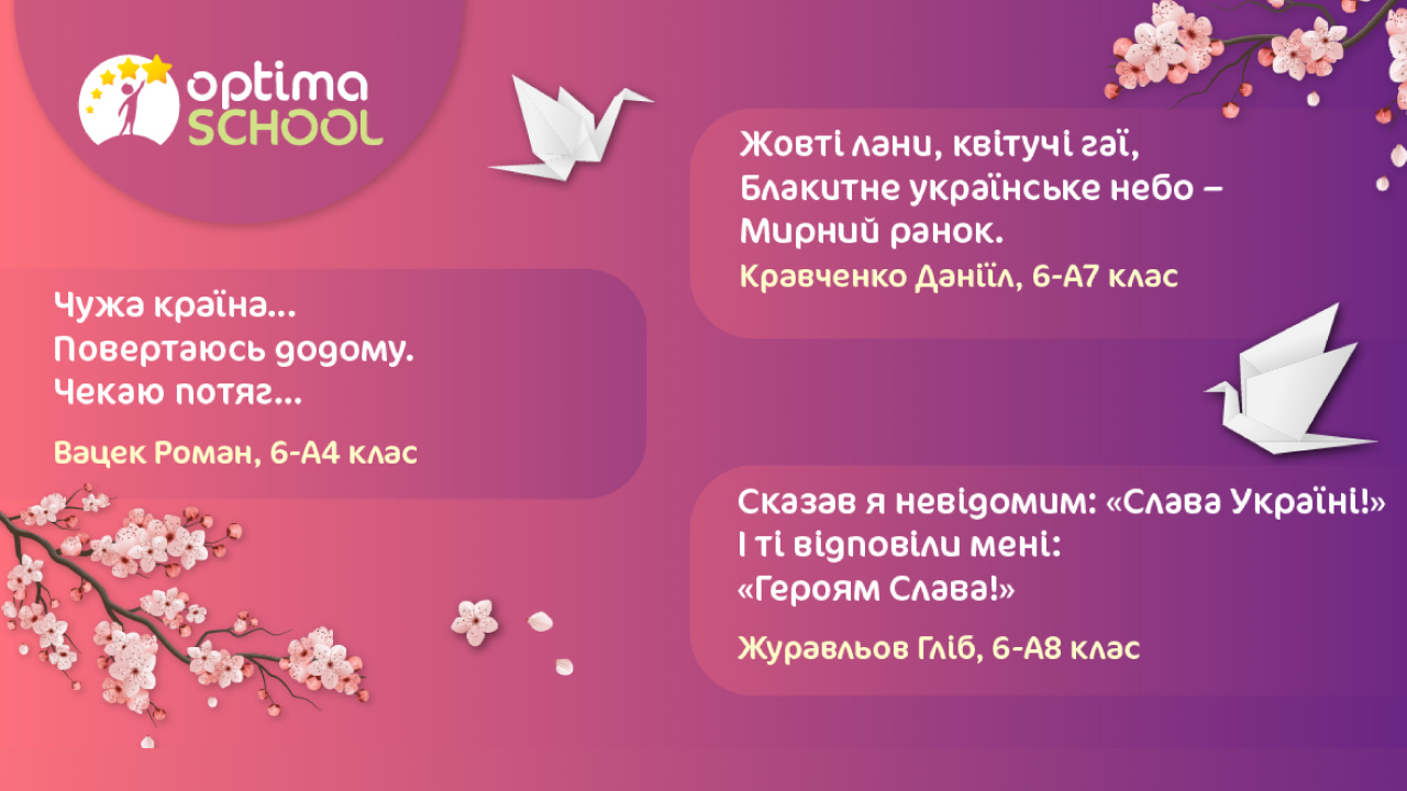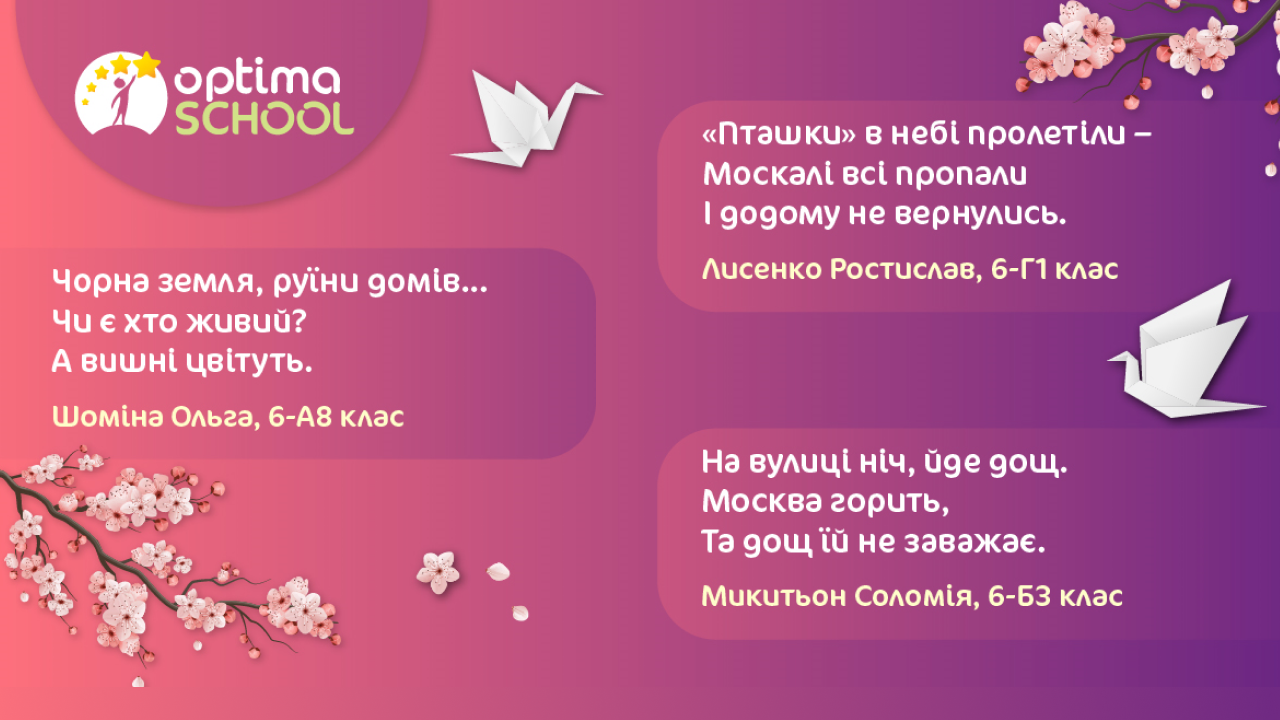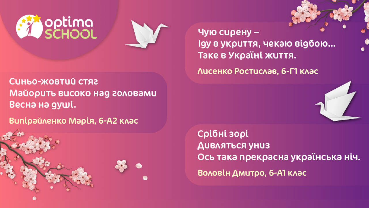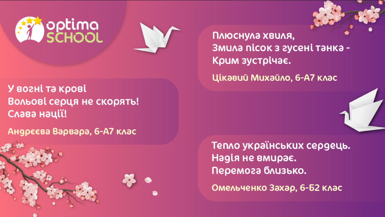 Учні шостого класу описували в хайку свої мрії про скорішу перемогу, бажання якомога швидше повернутися додому та поїхати до Криму. В усіх віршах ОПТИМістів можна побачити незламний дух українців, силу та міць нашого народу, гордість за рідну Україну.
