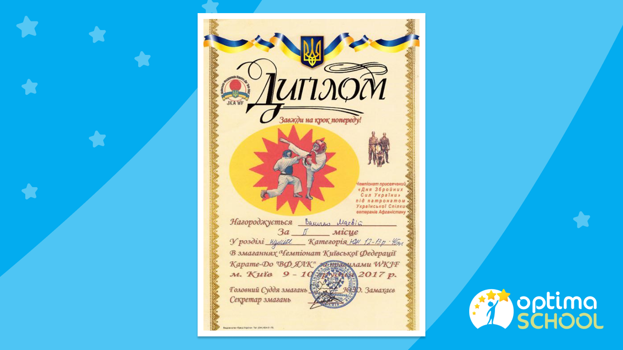Педагогічний колектив ТОВ «Центр освіти «Оптіма» бажає Матвію успіхів в навчанні, нових досягнень та перемог у спорті!