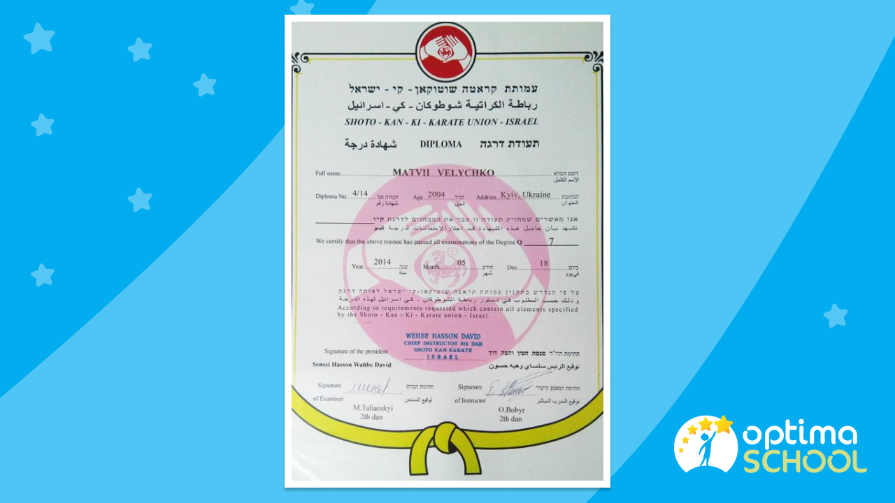 Матвій - володар жовтого поясу по карате, що підтверджується Дипломом, виданим 18.05.2014 року Союзом Shoto Кan Ki Karate, Ізраїль.